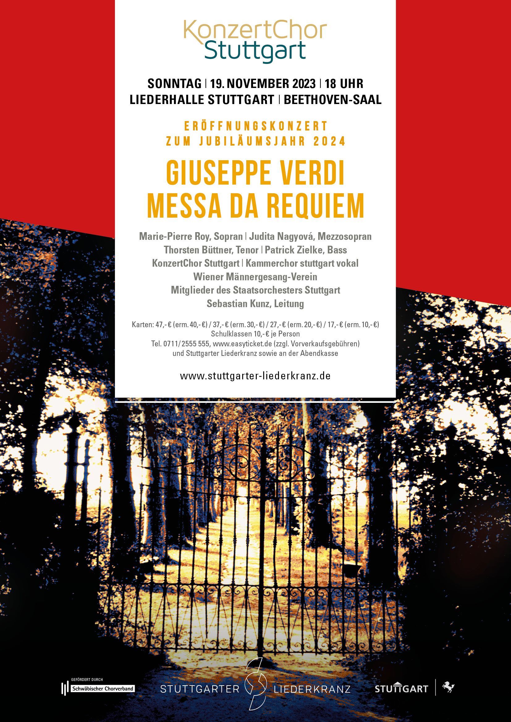 Ehrfürchtige Stille, dann tosender Applaus und Standing Ovation - so endete das Konzert letzte Woche in Wien. In der ehrwürdigen Kulisse des Goldenen Saals in Wien erlebte das Publikum einen unvergesslichen Abend voller Emotionen und musikalischer Brillanz, als der KonzertChor Stuttgart gemeinsam mit dem Konzertchor und Stammchor des Wiener Männergesang-Verein (WMGV), dem Kölner Männer-Gesang-Verein (KMGV), dem KünstlerOrchesterWien und dem Anima Musicae Kammerorchester das Verdi Requiem zum Leben erweckte. Unter der einfühlsamen Leitung des Dirigenten Daniel Cséfalvay entfaltete sich das Werk in seiner ganzen Pracht, von zarten Momenten der Trauer bis hin zu kraftvollen Ausbrüchen der Hoffnung. Die harmonischen Klänge füllten den Goldenen Saal und schufen eine ganz besondere Atmosphäre. „Die Höhepunkte im Konzert für mich waren das ehrfürchtige „Kyrie“, das „Tuba mirum“ mit den Ferntrompeten, das majestätische „Rex tremendae“, das weltumfassende „Agnus Dei“ und die letzten flehenden Worte des „Libera me“ - so der Dirigent. Dank geht natürlich auch an die hervorragenden Solisten Yoora Lee Hoff, Lúcia Megyesi Schwartz, Szerekován János und Nicolas Legoux. Die Begegnung zwischen dem Konzertchor Stuttgart und dem Wiener Publikum war nicht nur ein musikalisches Ereignis, sondern auch ein kultureller Austausch, der die Verbindung zwischen allen vertiefte. Diese kulturelle Brücke wurde durch die begeisterte Reaktion des Wiener Publikums auf die Darbietung des Chors gestärkt. Doch es gilt auch: nach dem Konzert ist vor dem Konzert! Bereits am 19.11.2023 folgt der Gegenbesuch des Wiener Männergesangsverein in Stuttgart und die Liederhalle in Stuttgart wird Schauplatz kultureller Begegnungen. Abermals wird die „Messa da Requiem“ von Giuseppe Verdi dargeboten, ein Stück von unvergleichlicher Intensität und emotionaler Tiefe. Der Austausch zwischen dem Wiener Männergesang-Verein und dem KonzertChor Stuttgart wird nicht nur die musikalische Expertise beider Chöre hervorheben, sondern auch die kulturelle Vielfalt und die menschliche Verbundenheit feiern. Und so freuen wir uns auf die kommenden musikalischen Abenteuer und darauf, wie die Klänge der Musik uns weiterhin zusammenbringen, inspirieren und lang anhaltende Erinnerungen schaffen. So gestärkt und ermutigt starten wir in das Jubiläumsjahr - immerhin geht es um 200 Jahre des Stuttgarter Liederkranz 1824 e.V.!